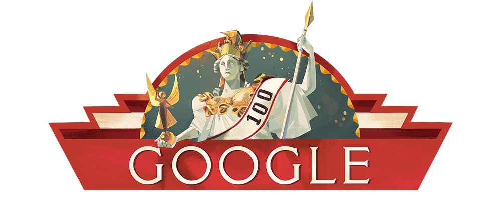 Auf dem heutigen Doodle ist die Figur des Pallas-Athene-Brunnen vor dem österreichischen Parlament an der Wiener Ringstraße zu sehen. Geschaffen wurde die in Österreich wohlbekannte Figur von Karl Kundmann. Heute trägt sie neben dem bekannten Schmuck im Doodle auch noch eine Scherpe mit einer 100 darauf. Mit dieser Zahl zelebriert Google zusätzlich den 100. Jahrestag der Gründung von Deutschösterreich. Das Google-Logo befindet sich wie üblich in Großbuchstaben direkt unter der gesamten rot-weiß-roten Verzierung des Doodles.