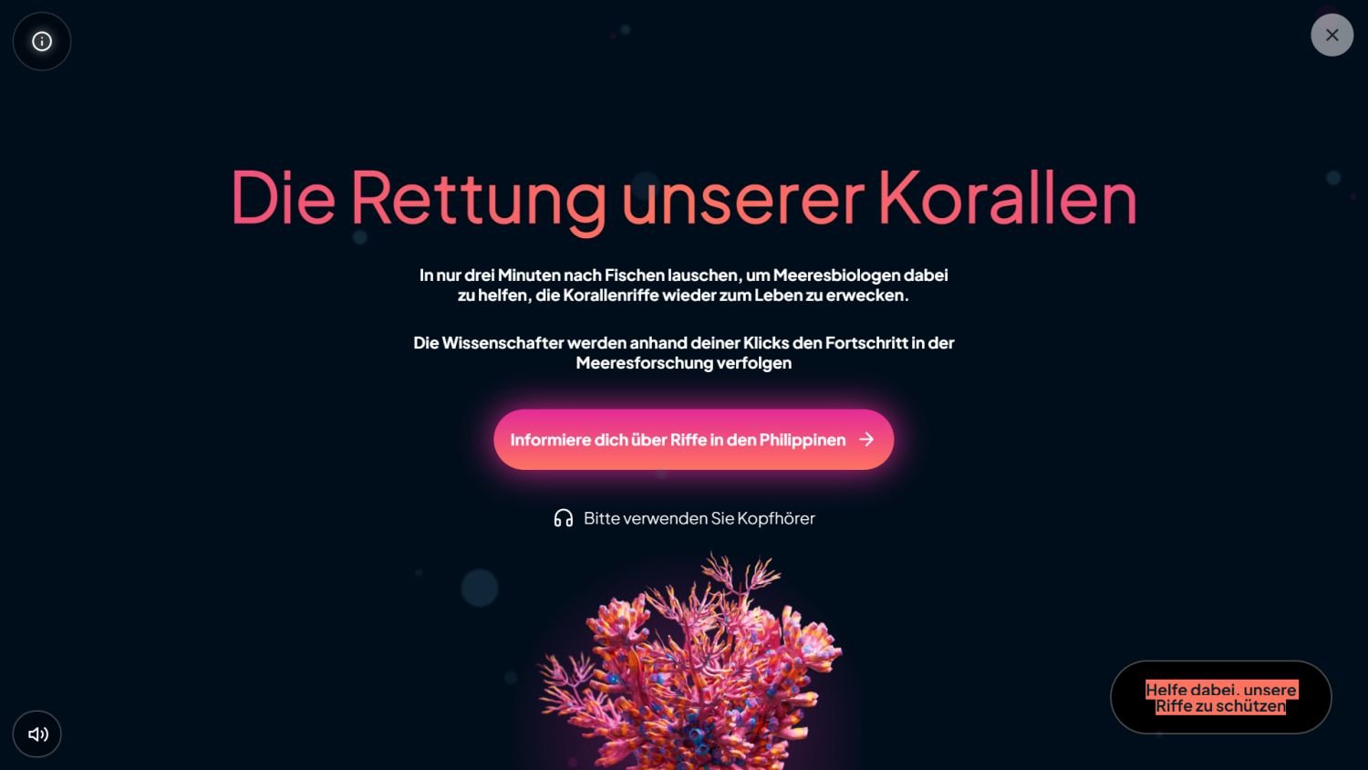 In nur drei Minuten hilfst du Meeresbiologen bei ihrer bioakustischen Ozeanregenerationsarbeit – bei dem Versuch, beschädigten Korallen wieder Leben einzuhauchen.