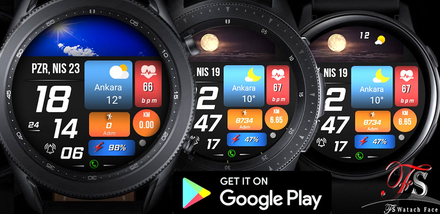 Bei dem Watch Face mit dem wenig klingenden Namen „FSW231“ handelt es sich um ein Ziffernblatt, das nicht mit Informationen geizt. Obwohl die Uhrzeit ein gutes Drittel der Smartwatch einnimmt, hat der Entwickler noch Platz für sehr viel mehr Details gefunden. Das beginnt schon am oberen Rand, der mit einer wirklich schicken Grafik gefüllt ist, die über den Tagesverlauf bzw. Nachtverlauf informiert. Darunter befindet sich auf der linken Seite die Uhrzeit und auf der rechten Seine eine Anordnung von Kacheln.