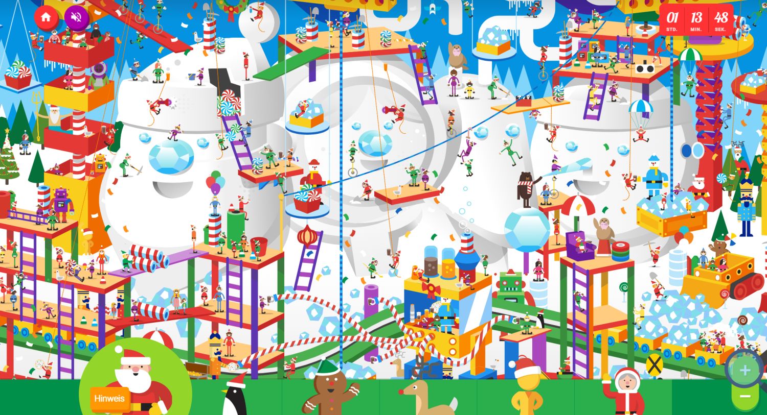 Wimmelbilder sind immer wieder eine tolle Sache und können Jung und Alt begeistern – das weiß auch das Team des Google Santa Tracker. Dort gibt es zur Verkürzung der Wartezeit auf die Bescherung jetzt ein Spiel, das sich an der schönen Wimmelbild-Tradition orientiert und den Nutzern die Möglichkeit gibt, den Weihnachtsmann in einer vielbeschäftigten und wuseligen Szenerie zu suchen. Aber nicht nur der Weihnachtsmann will gefunden werden, sondern auch Mrs. Claus, ein Lebkuchenmann, Rudolf oder ein Pinguin.