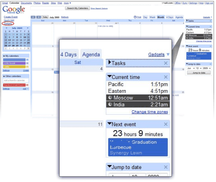 Weitere Gadgets sind: Add Tasks, Add Googler Search, Add Jump to Date, Add Next Meetings, Add Time Zones und Add Where Are My Friends?