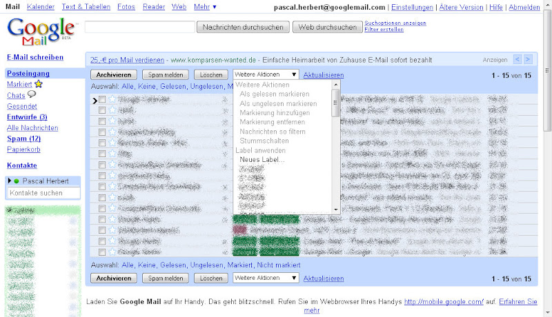 Vorhin habe ich mal wieder geschaut, ob mein Google Mail jetzt endlich mal Google Mail 2.0 auf deutsch liefert. Tatsächlich beim Laden wird jetzt …wird geladen angezeigt. Auch die anderen Google Mail-2.0-Funktionen wie farbige Labels oder der Unsichtbarkeitsmodus sind auf deutsch vorhanden.