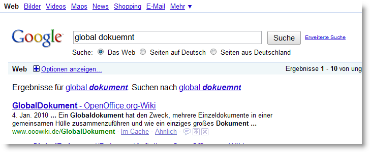 Ein Leser schrieb mir gestern mit diesem Betreff eine Mail. Als er auf der Suche nach einer Anleitung war, wie man die Funktion „Globaldokument“ von OpenOffice richtig nutzt, gab er bei Google „global dokuemnt“ ein. Doch Google zeigte ihm nicht „Meinten Sie“ an.