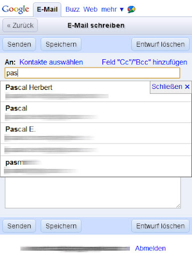Google hat jetzt auch das Desktop-Feature auf die Mobil-Telefone und -Pads dieser Welt gebracht. Jetzt gibt es bei Google Mail Mobile die Autovervollständigung für E-Mail-Adressen und Namen aus der Google Mail-Kontakt-Liste.