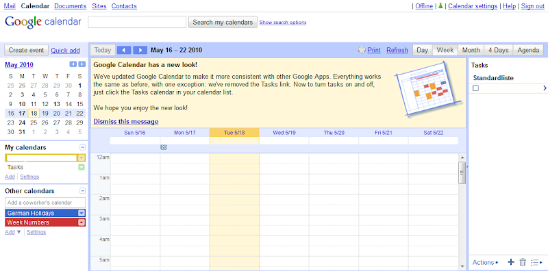 Sieht gut aus! Nur schade, dass die Aufgaben rechts so wenig Platz haben. Hier würde ich mir eine verschiebbare Leiste zwischen Terminen und Aufgaben wünschen. So muss ich mir wieder mit User-CSS behelfen.
