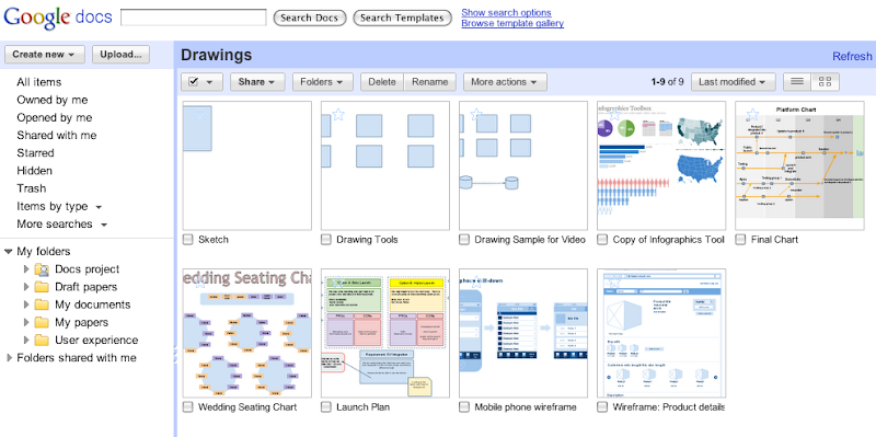 Seit einiger Zeit gibt es neben der Listenansicht in Google Docs auch eine, die eine Vorschau auf die Dateien ermöglicht. Google hat nun Drawing zu dieser Ansicht ergänzt. Damit ist es einfacher und schneller möglich eine Zeichnung zu finden.
