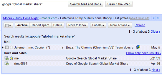 Google hat diese Tage still und heimlich ein neues Experiment in den Google Mail Labs veröffentlicht. Mit App Search bzw. Anwendungssuche werden in den Suchergebnissen von Google Mail auch Resultate aus Google Sites und Google Text & Tabellen angezeigt.