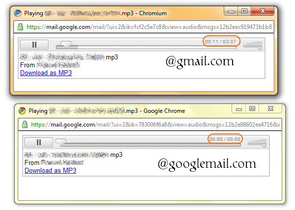 Eine Blockade mithilfe der Ortung der IP kann man ausschließen, da wie uns mehrere Leser mitgeteilt haben am selben PC die @Google Mail.com-Adresse das mp3 abspielt. Dies bestätigt auch unsere Test. Bereits vor rund zwei Jahren gab es im Google Mail-Forum (damals noch eine Google Group) eine Diskussion darüber, wenn ich mich recht entsinne. Damals hieß es, dass man das Problem an das zuständige Team weitergeleitet hätte.