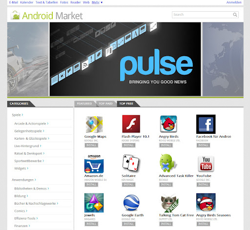 Der Android Market im Web, welcher unter market.android.com ab sofort zu erreichen ist, bringt eine Neuerung mit, auf die man sicher schon gewartet hat. Man kann Apps aus der Ferne installieren und kaufen. Der Market an sich ist sehr strukturiert und übersichtlich aufgebaut. Die Bilder und Screenshots sind ausreichend groß, alles ist wirklich wie eine Webseite optimiert. Zur linken Seite findet man die Navigation, auf der rechten sind dann die Apps. Wählt man eine App aus, so hat man schnell einen Überblick, viele tolle Screenshots und auf der rechten Seite die Details, wie Bewertung, Größe, etc.. Auch kann man Apps nun vernünftig weitergeben, da der QR-Code direkt auf der Seite ist. Wer nun den Market-Link vom PC anklickt, kommt auf die Web Market-Seite. Auf dem Telefon wird direkt der Android Market geöffnet – eine sehr praktische Sache.