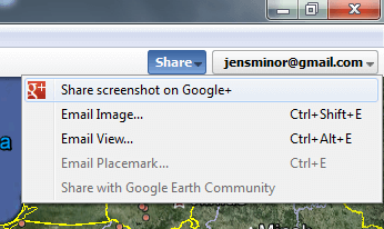 Mit der neuesten Version orientiert sich Google Earth an Picasa und hat nun ebenfalls in der oberen rechten Ecke einen Login-Link. Ist man einmal eingeloggt, kann man die aktuelle Ansicht nicht nur per eMail versenden, sondern den Screenshot auch gleich bei Google+ mit seinen Kreisen teilen. Leider funktioniert das ganze derzeit so überhaupt nicht.