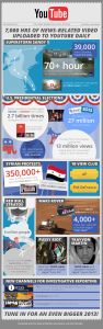 So werden jeden Tag über 7.000 Stunden an Nachrichtenmaterial auf YouTube hochgeladen. Das entspricht rund 292 Tagen. Beim Sturm Sandy gab es 39.000 Uploads zu diesem Thema innerhalb einer Woche, den über 70 Stunden langen Live-Stream des Weather-Channels schauten 13 Millionen Menschen.