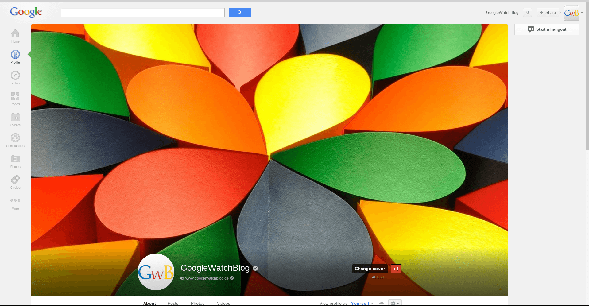 Wie ihr sehen könnt, kann man diese Funktion auch auf Google+ Seiten bereits nutzen. Zudem hat Google auch den Look der Über/About -Seite überarbeitet. Die einzelnen Elemente, die man dort füllen kann, haben nun jeweils eine Box, die unterschiedliche Farben im Header hat. Als Beispiel unsere Google+ Page. Fährt man im Stream über das Profilbild des postenden, dann erscheint auch hier der PopUp in einem anderen Look: