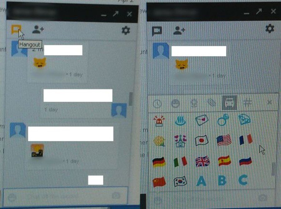 Die Screens zeigen die überarbeitete Version des Chats im Browser. Die Grundform ist gleich geblieben und auch die meisten der bekannten Features und Funktionen sind noch vorhanden, soweit man es auf den Screenshots erkennen kann. So lassen sich Hangouts direkt aus dem Chat starten. Der Chat wird in einem Log gespeichert, was sich aber deaktivieren lässt. Deutlich erweitert hat Google aber scheinbar die Emoticons und überarbeitet.