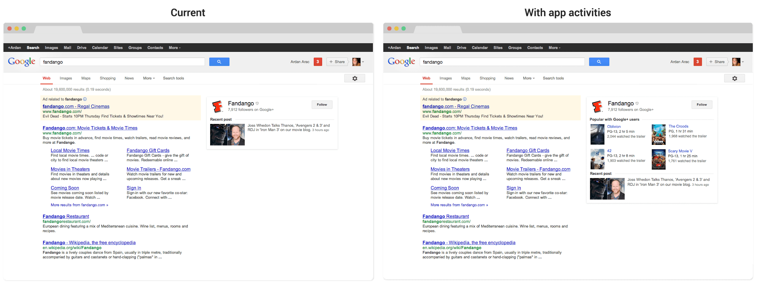 So werden demnächst aggregierte Daten von den Nutzern der App mit Google+ Sign-In verwendet um zum Beispiel beliebte Inhalte der Webseite in der Sidebar anzuzeigen. Dies können zum Beispiel Zuschauerzahlen bei einem Trailer sein. Zunächst wird Google diese Funktion für google.com auf Englisch zur Verfügung stellen. Weitere Sprachen werden dann sicherlich folgen, sobald es weitere Anpassungen gegeben hat.