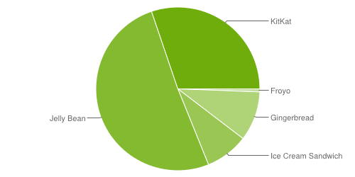 Google hat nach zwei Monaten mal wieder neue Zahlen zur Verbreitung der Androidzahlen veröffentlicht. Aus diesen geht hervor, dass Kitkat erstmals die 30% Marke übersprungen hat. Dafür hat Android 4.4 ein Jahr gebraucht.