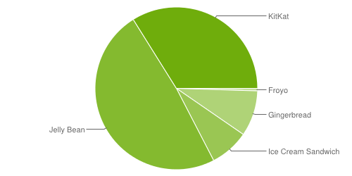 Google hat neue Zahlen zur Verbreitung der einzelnen Android Versionen veröffentlicht. Lediglich Kitkat aka Android 4.4 konnte seinen Anteil steigern. FroYo bis Jelly Bean geben Marktanteile ab.