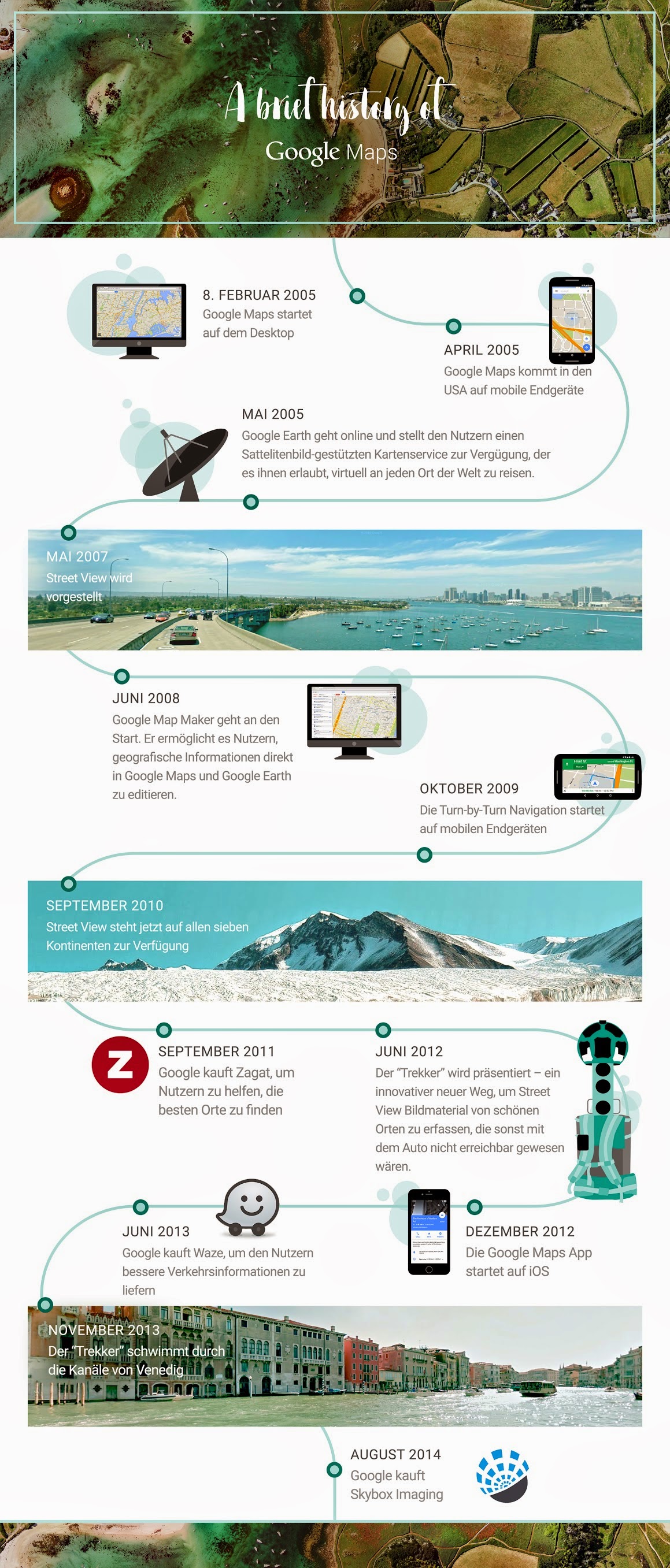 Einer der prominentesten Google-Services neben der Websuche feiert am heutigen 8. Februar seinen 10. Geburtstag: Die Google Maps wurden am 8. Februar 2005 gestartet und haben sich von Anfang an großer Beliebtheit erfreut – unter anderem auch durch das für damalige Verhältnisse neue Bedienkonzept. Statt ständig neue Kartenansichten mit einer umständlichen Navigation laden zu müssen, konnte der Kartenausschnitt bei den Maps einfach per Drag & Drop verschoben werden. Eine Infografik zeigt die wichtigsten Meilensteine.