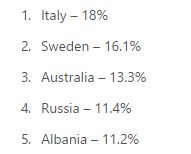Glaubt man den Analysen von Microsoft, und bisher hatte Bing bei solchen Ereignissen stets eine sehr gute Trefferquote, werden die Italiener morgen den Titel mit nach Hause nehmen. Aber auch die Australier befinden sich „nur“ auf dem Dritten Platz. Da Australien bekanntlich nicht in Europa liegt, und in diesem Jahr nur ausnahmsweise zum Jubiläum teilnehmen darf, wäre es natürlich sehr interessant wenn die Interpreten aus Down Under gewinnen. Ob der EUROPÄISCHE Song Contest dann im nächsten Jahr in Australien stattfindet? Man darf gespannt sein 😉