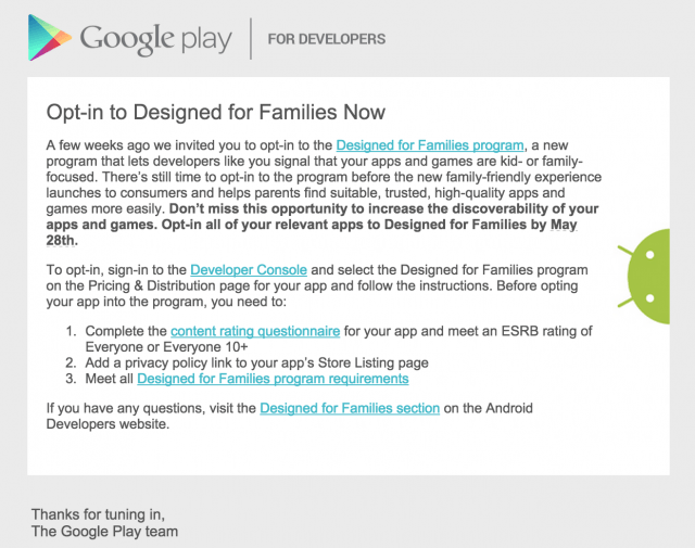 Während man in der Ankündigung vor vier Wochen keinen Starttermin genannt hat, ist dieser nun durch eine Erinnerungsmail an Entwickler verraten worden. Noch bis zum 28. Mai haben Entwickler Zeit ihre Apps einzutragen – und dieser Termin fällt genau auf die Entwicklerkonferenz I/O. Natürlich kann es ein gewaltiger Vorteil sein wenn man von Anfang an dabei ist und so noch vom Play Store supportet wird. Allerdings muss natürlich auch jeder Entwickler selbst entscheiden, ob die eigene App denn nun familienfreundlich ist oder eben nicht.