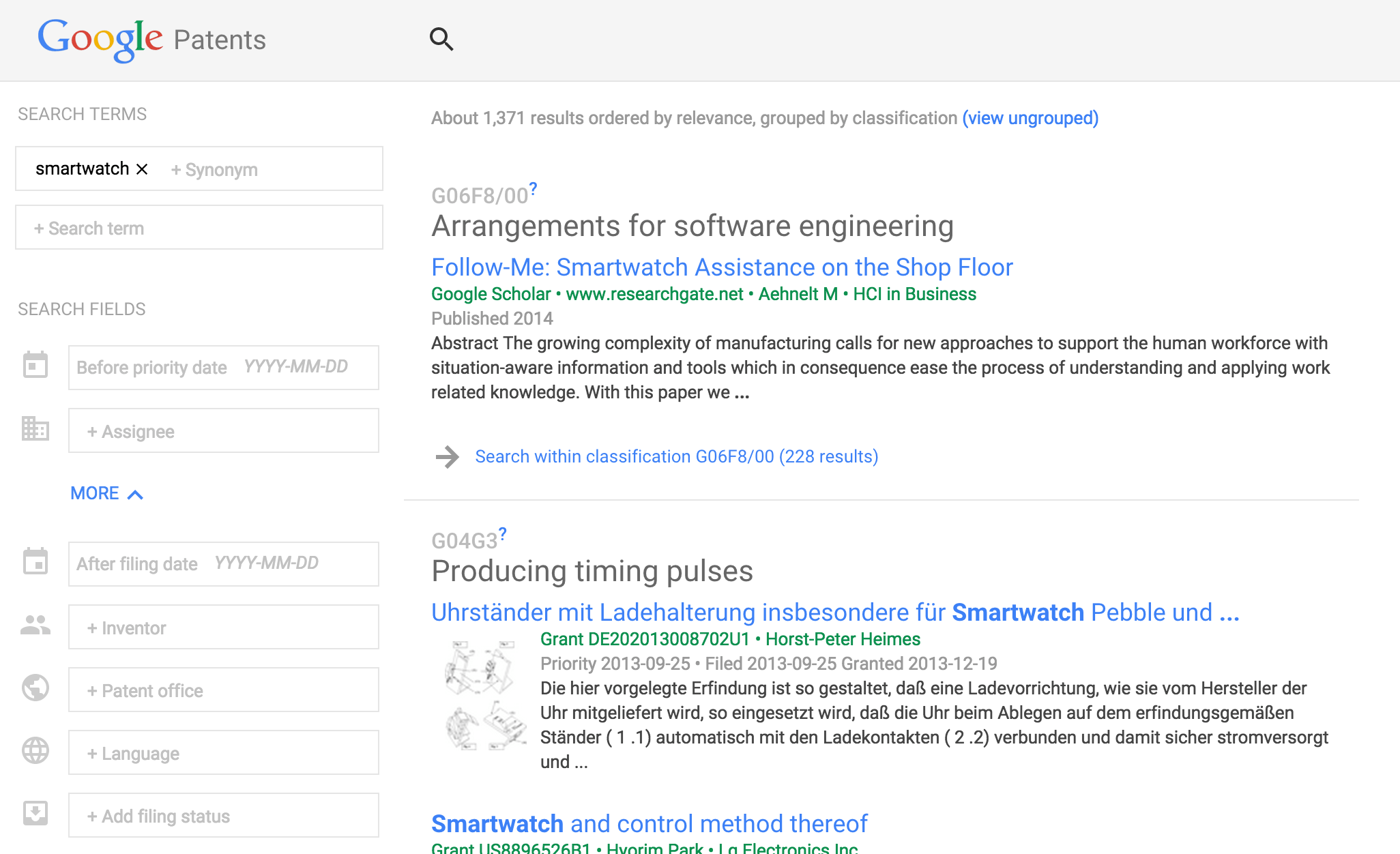 Auch die Auflistung der Suchergebnisse wurde vom Design überarbeitet und erinnert nun ebenfalls stark an das Material Design, wenn auch nicht konsequent umgesetzt. Ergebnisse werden nun außerdem nach Gruppen sortiert und nicht mehr nur einfach aufgelistet, was aber mit einer Einstellung am oberen Rand der Suchergebnissen deaktiviert werden kann. Außerdem wurden nun auch Ergebnisse aus der Suchmaschine Google Scholar mit aufgenommen und werden optional in den Suchergebnissen angezeigt. Damit kann die Patentsuche erstmals auch nach Informationen, Beschreibungen oder auch technischen Dokumenten suchen die (noch) nicht als Patent eingereicht worden sind.