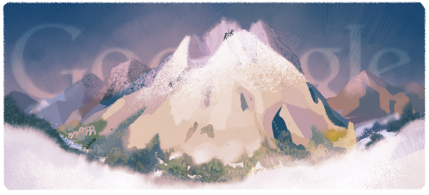 Das Doodle zeigt den Mont Blanc, der genau auf der französisch-italienischen Grenze in der Alpenregion liegt, mit seinen grünen Wiesen und der schneebedeckten Spitze. Erst bei genauerem Hinsehen sieht man, dass auf dem Berg auch noch zwei Menschen zu sehen sind, die sich gerade auf dem Weg an die Spitze machen. Dahinter scheint das Google-Logo hervor, wobei das kleine g und das kleine l ein Teil des Berges geworden sind.