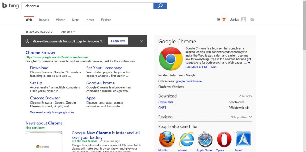Eins der ersten Dinge nach der Installation einer neuen Windows-Version ist für viele Nutzer der Download des gewohnten Browsers – also in den meisten Fällen Chrome oder Firefox. Das dürfte auch bei Windows 10 nicht anders sein, das bekanntlich einen neuen Browser mitbringt und den ungeliebten Internet Explorer abgelöst hat. Da sich mit der neuen Suchleiste von Windows auch direkt Suchanfragen an Bing stellen lassen, dürften viele Nutzer zum Download der beiden Browser also (einmalig) die Bing-Suche verwenden. Und in dieser werden sie nun darauf hingewiesen, doch bitte weiterhin bei Edge zu bleiben.