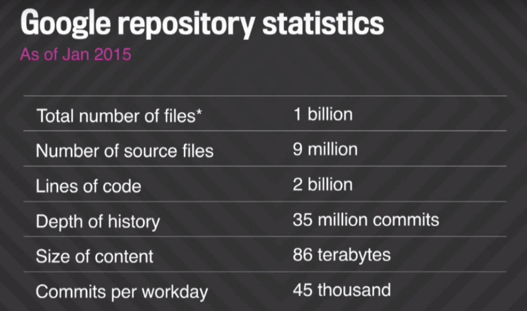 Insgesamt besteht „Google“ aus über 1 Milliarde Dateien, wobei diese aber nur aus 9 Millionen Source-Dateien bestehen. Insgesamt haben die Googler im Laufe der letzten Jahre 2 Milliarden Zeilen Code geschrieben, wobei es über 35 Millionen Änderungen gegeben hat. Die gesamte Google-Software belegt auf den Servern einen Platz von 86 Terabyte. Und die Googler sind jeden Tag fleißig – denn pro Tag gibt es etwa 45.000 Änderungen an der gesamten Codebasis.