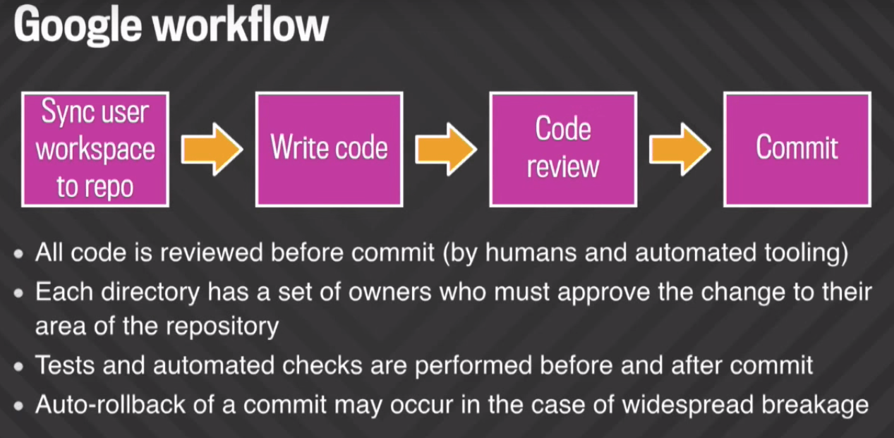 Interessant ist natürlich auch, wie diese gewaltige Codebasis verwaltet wird, und wie sicher gestellt wird dass dabei kein Schindluder getrieben wird: Die meisten Entwickler können tatsächlich auf die gesamte COdebasis zugreifen und diese auch ändern – allerdings ist diese Änderung nur temporär auf ihren Systemen. Erst nach Fertigstellung werden die Änderungen synchronisiert und müssen dann freigegeben werden. Dazu werden diese sowohl von Menschen als auch von Algorithmen geprüft und anschließend weiter geleitet. Jedes Verzeichnis mit Dateien hat dabei eine Reihe von Besitzern, die dieses verwalten und die Änderungen dann endgültig freigeben dürfen.