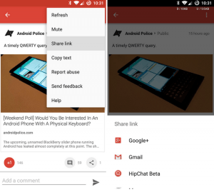 Bei einigen Nutzern taucht sporadisch immer wieder der neue Eintrag „Share Link“ im Menü eines Beitrags auf. Mit einem Touch öffnet sich der native Sharing-Dialog von Android, in dem alle möglichen Apps enthalten sind und die mit einem Touch ausgewählt werden können. So lässt sich auch ein Google+ Beitrag dann sehr schnell in Facebook einstellen, per WhatsApp verschicken oder eben auch in eine Mail einfügen. Geteilt wird dabei dann nur der Link, ohne einen weiteren Titel oder einleitenden Text, so dass man direkt mit diesem geteilten Inhalt auch „arbeiten“ kann.