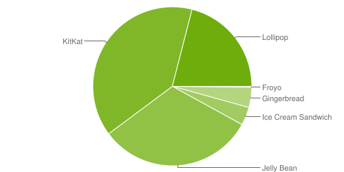 Lollipop aka Android 5.0 und 5.1 überspringt erstmals die 20%-Marke und erreicht nun 21% der Geräte (+2,9%). Einzeln aufgeteilt sind das für Android 5.0 15,90% (+0,40%) und für Android 5.1 5,10% (+2,50%)