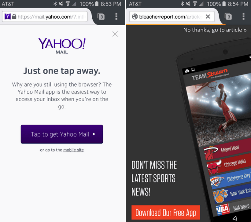 Auch wenn sich die Situation mittlerweile schon wieder etwas gebessert hat, gibt es noch immer Millionen von Webseiten die entweder keine mobile Ansicht haben oder ihren Nutzern den eigenen Inhalt lieber per App präsentieren. Wer eine solche Seite besucht, bekommt nicht etwa den aus der Websuche versprochenen Inhalt zu sehen, sondern muss sich erst durch das Vollbild-Overlay klicken. Dabei muss man auch meist sehr gut aufpassen, nicht auf die falsche Stelle zu klicken und dann doch versehentlich im Play Store zu landen. Wie man an obigen beiden Beispielen sieht, ist zum Klicken der „Nein, Danke“-Links schon etwas Fingerspitzengefühl erforderlich.