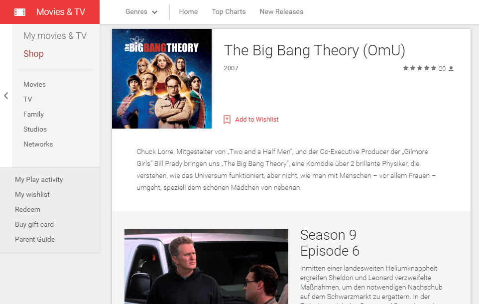 Von der beliebten Serie „The Big Bang Theory“ etwa gibt es bereits die ersten sechs Folgen der siebten Staffel, die in den USA seit einigen Wochen ausgestrahlt wird. Lediglich die Folge 7, die gestern Abend (US-Zeit) über die Fernseher lief, fehlt in Google Play derzeit.