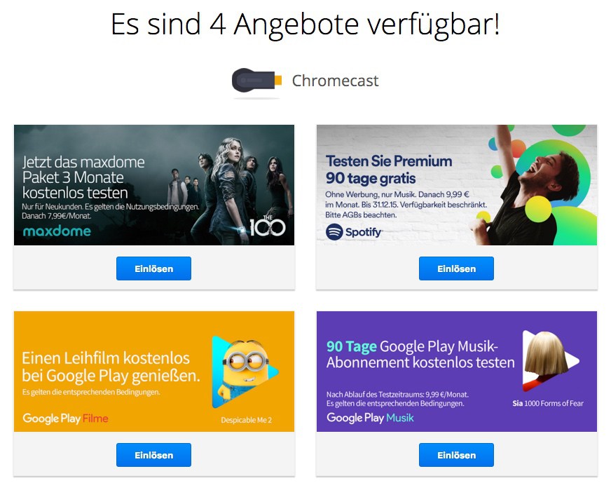 In unregelmäßigen Abständen hält Google immer wieder besondere Aktionen, Rabatte und Geschenke für Besitzer eines Chromecast-Sticks bereit, die ohne Verpflichtungen eingelöst und genutzt werden können. Seit heute gibt es nun wieder ein neues Angebot, das sich interessanterweise mal wieder auf einen Google-Konkurrenten bezieht: Auf der Angebots-Seite gibt es nun einen Link, mit dem man sich 90 Tage Spotify Premium Gratis sichern kann – allerdings gilt dies nur für Neukunden.