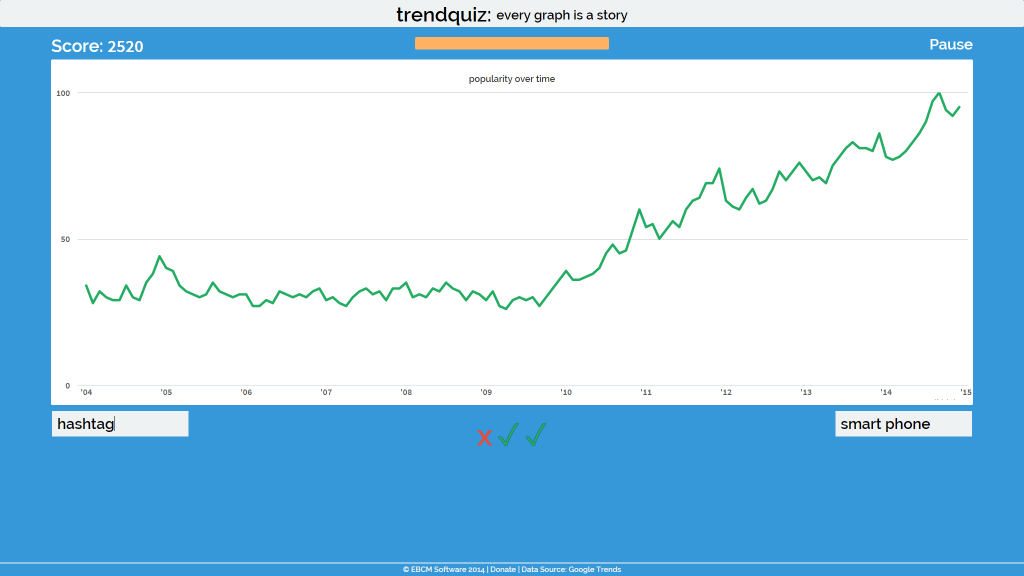 Mit den Google Trends lassen sich sehr umfangreiche Statistiken rund um die bei Google eingegebenen Suchanfragen aufstellen, die auch über Jahre zurück und mit geographischen und thematischen Einschränkungen aufbereitet werden können. Es gab schon eine Reihe von Spielen die den Nutzer auf Grundlage dieser Daten gefordert haben, doch diese waren oft nach einigen Runden alles andere als kurzweilig. Ein neues Spiel hat nun einen anderen Ansatz und zeigt dem Nutzer nur ein Diagramm, dass dann einem Begriff zugeordnet werden muss.