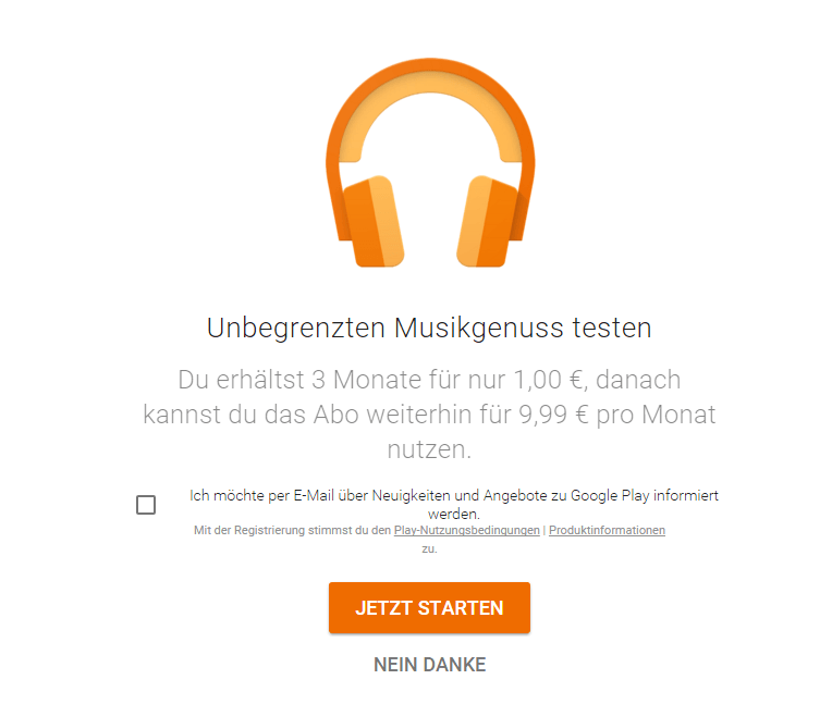 Ruft einfach diesen Link auf und schon öffnet sich Google Play Music mit obiger Meldung. Der nächste Klick kostet dann 1 Euro und bringt euch dann drei Monate Google Play Music in vollem Umfang. Anschließend muss das Abo wieder gekündigt werden, ansonsten verlängert es sich automatisch und kostet Monat für Monat 9,99 Euro. Doch wie bereits gesagt, steht das Angebot nur für Neukunden zur Verfügung und kann (leider) nicht ein aktuelles Abo verringern.