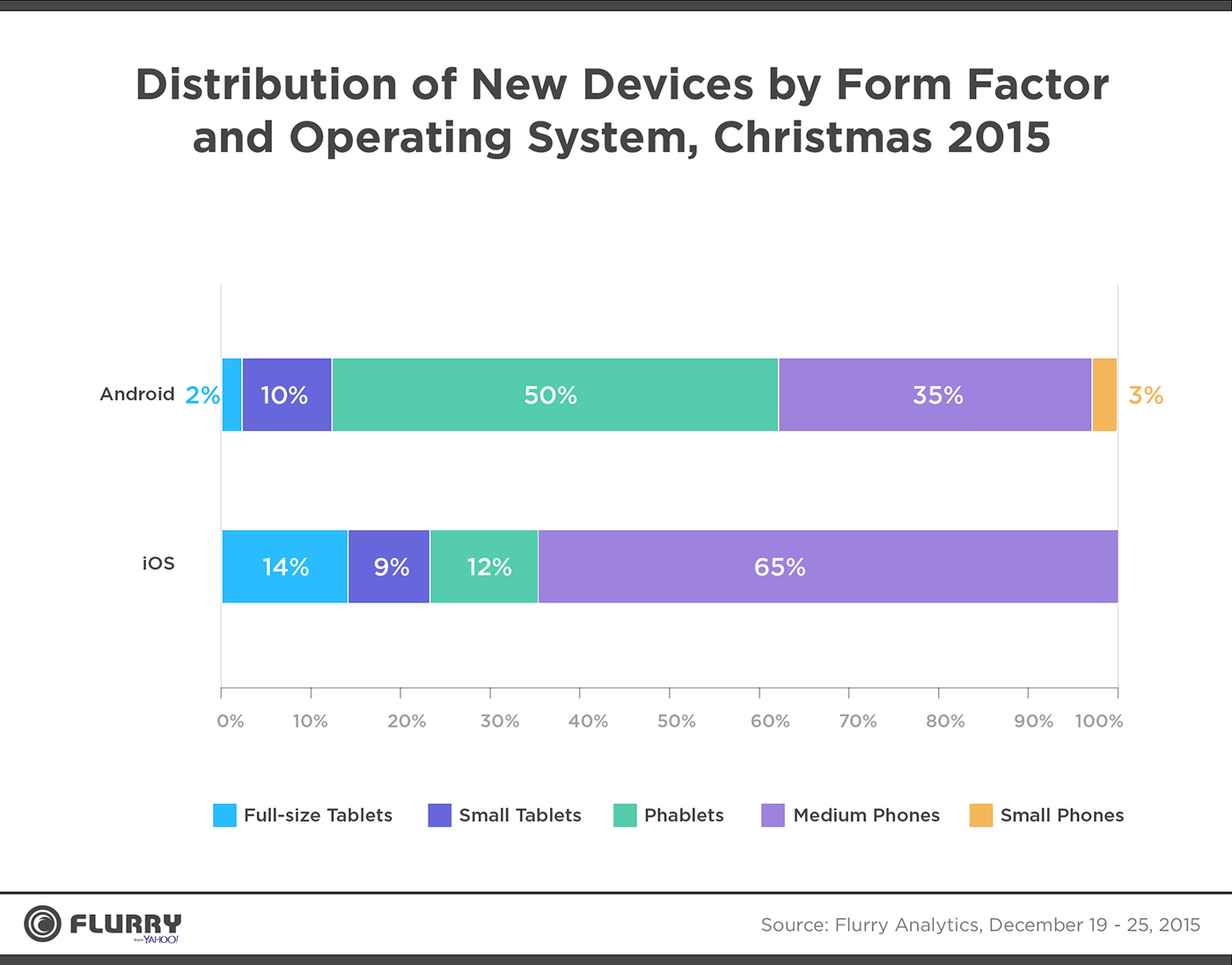 Obige Statistik zeigt die Beliebtheit der verschiedenen Gerätetypen: Hier ist eindeutig zu erkennen, dass sich der Markt gerade zu Weihnachten sehr schnell in Richtung Phablets verschoben hat (Smartphones mit einer Displaydiagonale von mehr als 5,5 Zoll). Jedes zweite Android-Gerät war ein Phablet, gefolgt den „normalen“ Smartphones mit 35% Anteil und den kleinen Geräten mit einem Anteil von nur noch 3%. Sehr gut zu erkennen ist auch, dass die Phablets den Tablets sehr starke Konkurrenz machen, denn nur 12% aller Android-Geräte die unter dem Weihnachtsbaum lagen waren ein Tablet. Bei Apple ist immerhin noch knapp jedes vierte verkaufte Gerät.