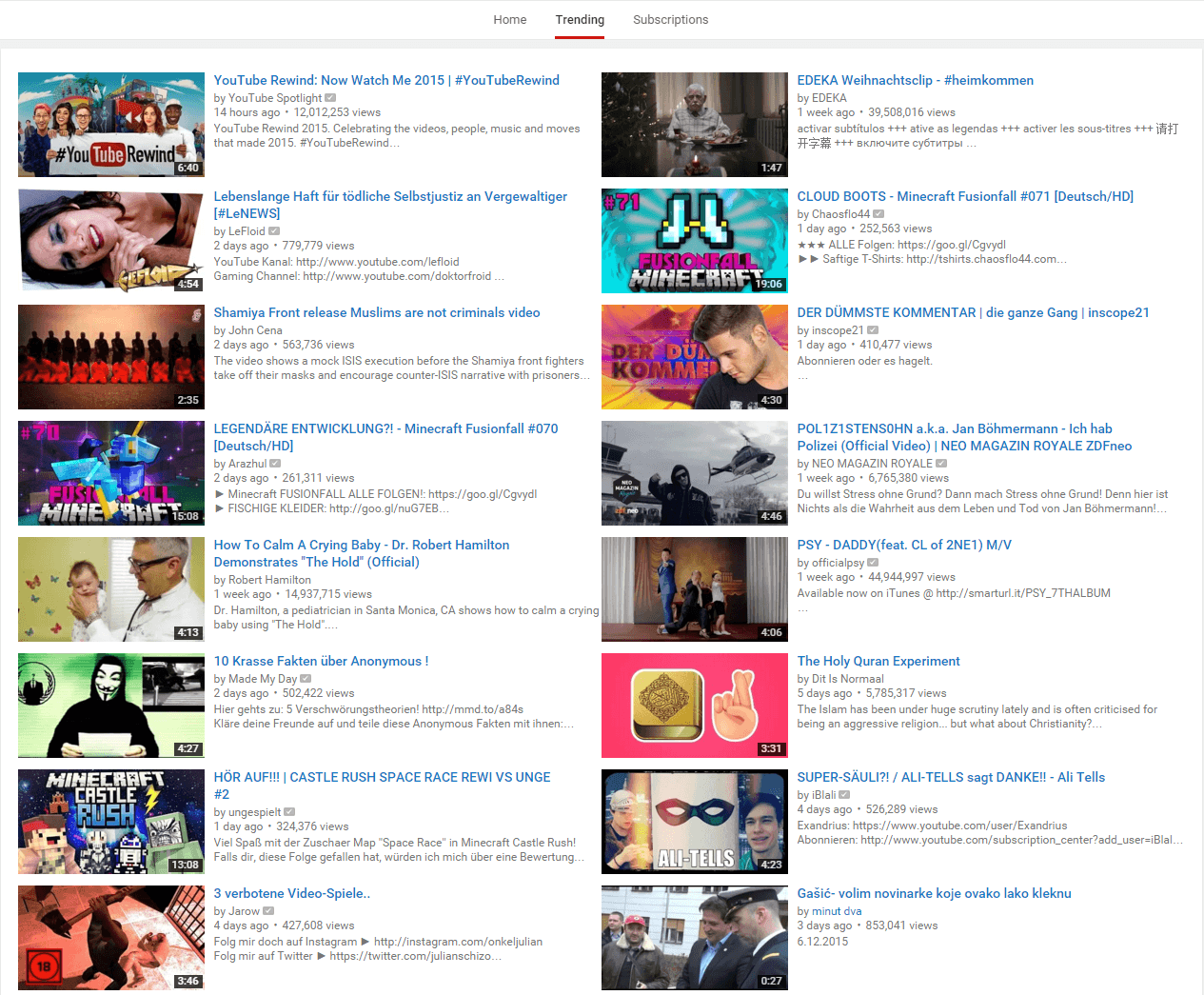 In dem neuen Tab, der im oberen Bereich der Navigation verlinkt ist, finden sich eine handvoll Videos, die gerade sehr populär sind und von vielen Quellen verlinkt worden sind. Wie genau das ganze berechnet wird ist natürlich nicht bekannt, es sollen aber Faktoren wie die Anzahl der Views, die Anzahl der Likes und Kommentare und auch einige weitere „externe Faktoren“ mit einbezogen werden. Bei letzterem dürfte es sich wohl um die Anzahl der Verlinkungen und Einbettungen auf Drittseiten handeln. Außerdem ist keines der angezeigten Videos älter als 5 Tage.