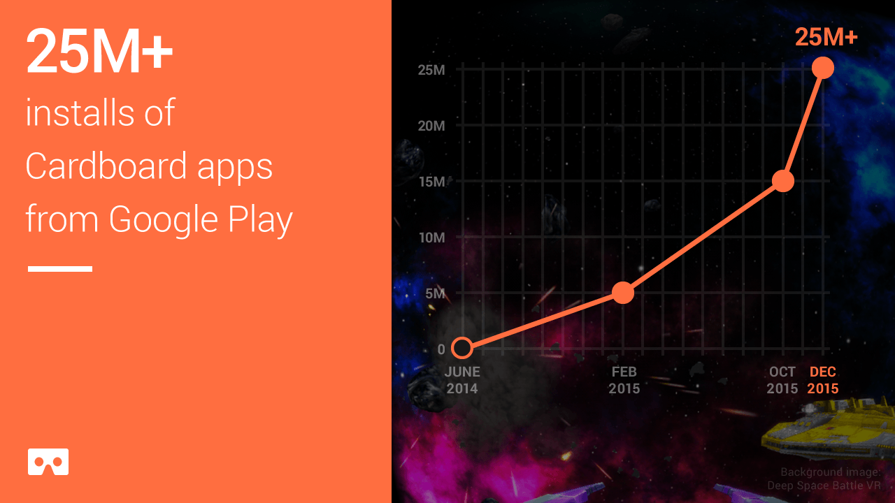 Für diese 5 Millionen Cardboards, bzw. deren enthaltenen Smartphones, wurden insgesamt mehr als 25 Millionen Downloads für spezielle Cardboard-Apps gezählt. Allein von Oktober bis Dezember des vergangenen Jahres kamen dabei 10 Millionen Downloads zu stande.