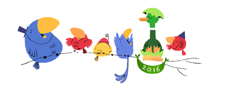 Passend zum Doodle des Vortags wünscht Google heute seinen Besucher ein Frohes Neues Jahr 2016. Es gibt verschiedene Tiere die aus dem Ei schlüpfen.