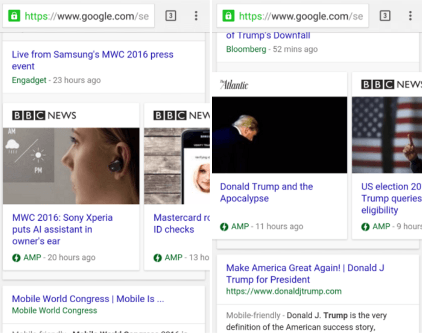 Vor wenigen Stunden sind in der Websuche erste Ergebnisse aufgetaucht, die die Integration von AMP-Webseiten zeigen: Gibt man ein Schlagwort zu einem aktuellen Thema ein, befindet sich über den Suchergebnissen ein Karussell mit mehreren Quellen zu diesem Thema, die dann allesamt auch in einer AMP-Version zur Verfügung stehen. Zusätzlich verfügen diese Links noch über das Logo der dahinterliegenden Webseite und unter dem Ergebnis befindet sich ein grünes Blitz-Icon mit den Worten „AMP“ dahinter.