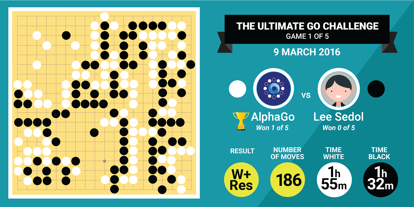 Die erste Runde konnte AlphaGo für sich entscheiden, allerdings lagen beide Spiele während des gesamten Spiels laut Beobachtern gleichauf und hatten auch nach mehreren Stunden noch Chancengleichheit. Nach gut dreieinhalb Stunden war das Spiel dann allerdings beendet. Insgesamt hat aber tatsächlich Googles KI mehr Bedenkzeit benötigt und hat insgesamt 1:54:30 „überlegt“, der Weltmeister hat dafür nur „1:31:32“ benötigt. Das Spiel ging über 186 Züge und ging mit dem Ergebnis „W+Res“ aus.