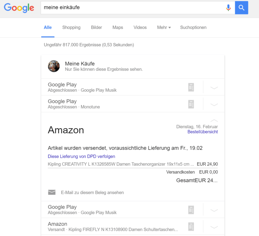 Meine Einkäufe: Die Google Websuche kann jetzt auch Bestellungen aus Onlineshops auflisten