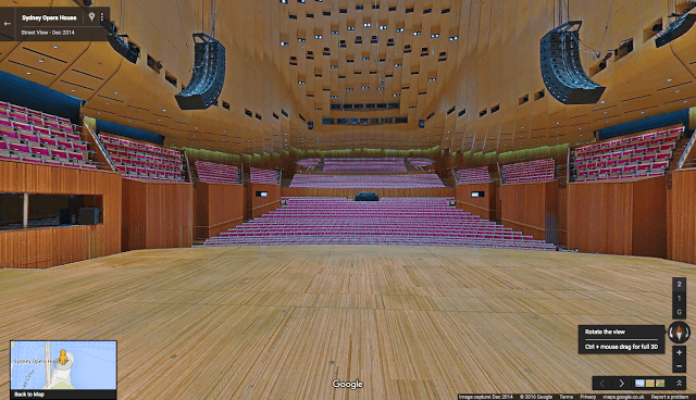 Von Innen hat das Streetview-Team die großen Konzersäle aufgenommen und bietet auch dort die Möglichkeit, sich frei zu bewegen – und zwar sowohl im Zuschauerbereich als auch auf der Bühne und hinter den Kulissen. Wer einmal den Blick der Künstler in der Concert Hall haben möchte oder wissen will, wie es sich anfühlt auf der Bühne im Joan Sutherland-Theater zu stehen, der kann dies nun tun – und von dort aus auch direkt in den Zuschauerraum springen und es sich auf einem der Sessel bequem machen.