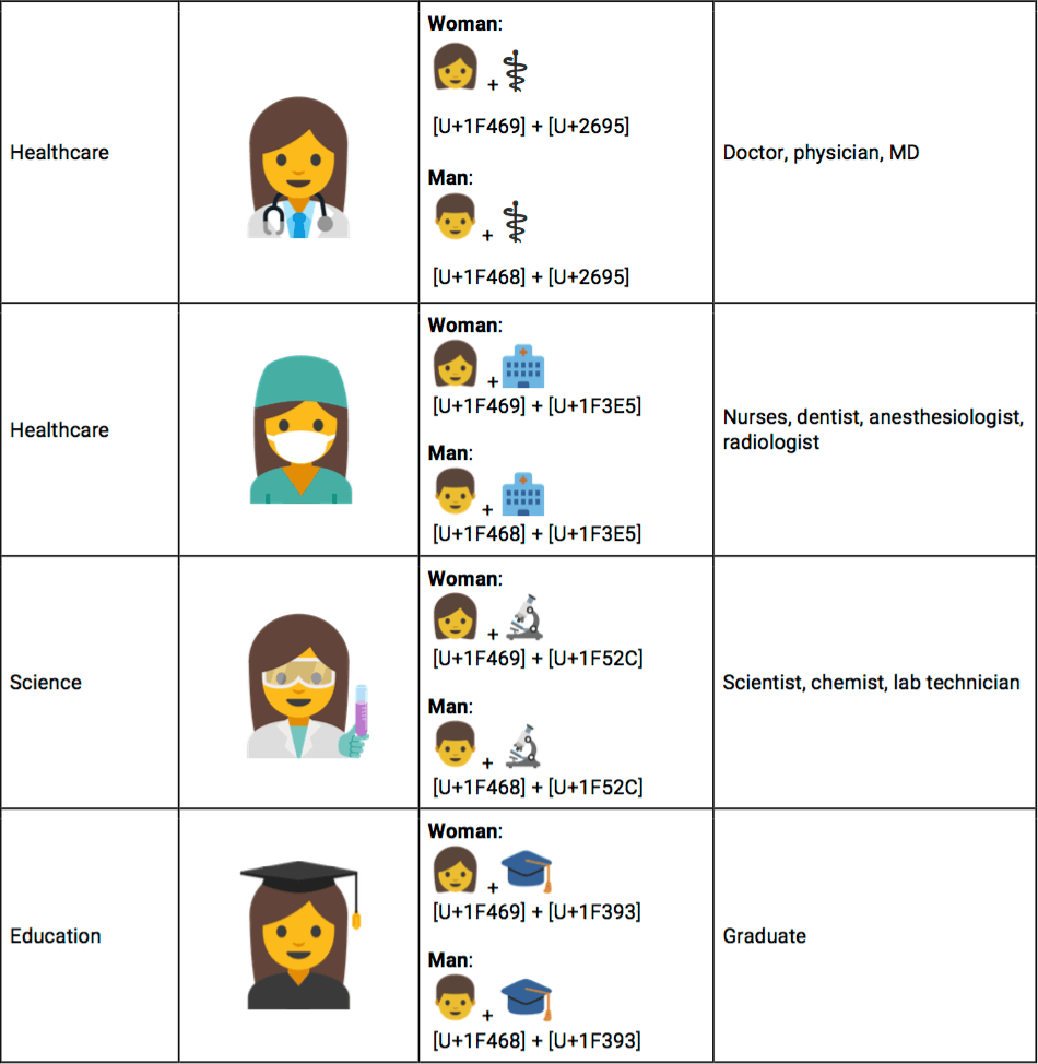 Die vorgeschlagenen Emojis bestehen rein nur aus Kombinationen von den bereits bestehenden Grafiken, so dass der Standardsatz nicht erweitert werden muss und die Umsetzung von den jeweiligen Apps und Plattformen abhängig ist. Durch die Kombination diverser Grafiken würde sich natürlich eine endlose Liste an Kombinationen ergeben, aber vorerst möchte man sich eben auf 13 Berufe spezialisieren, die tatsächlich auch fehlen und längst überfällig für eine Aufnahme sind.