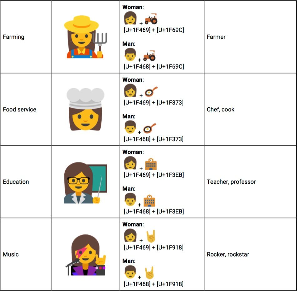 Die obigen 13 Emojis wurden von vier Googlern entworfen und sollen vor allem die weiblichen Gesichter auch in die Berufe bringen. In den Vorschlägen findet sich unter anderem eine Ärztin, eine Bauarbeiterin, einer Bäuerin oder auch ein Popstar. Damit in Zukunft aber nicht die Männer wegen Sexismus aufschreien, hatten die Googler eine pfiffige Idee: In Zukunft sollen Emojis kombiniert werden können, so dass der Satz gar nicht erweitert werden muss. Die Bäuerin bekommt man durch die Kombination aus der Frau und dem Traktor; Den Bauern hingegen aus der Kombination des männlichen Gesichts und des Traktors.