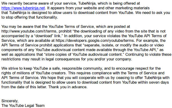 Ob auch andere große Plattformen ein solches Schreiben erhalten haben ist nicht bekannt, wahrscheinlich handelt es sich aber nur um einen Routine-Schritt: Möglicherweise wurde TubeNinja angeschwärzt und Googles Anwälte müssen natürlich auf so etwas reagieren. Wir dürfen gespannt sein ob Google bzw. YouTube ebenfalls noch einmal antwortet und ob man es tatsächlich auf ein Verfahren ankommen lässt.
