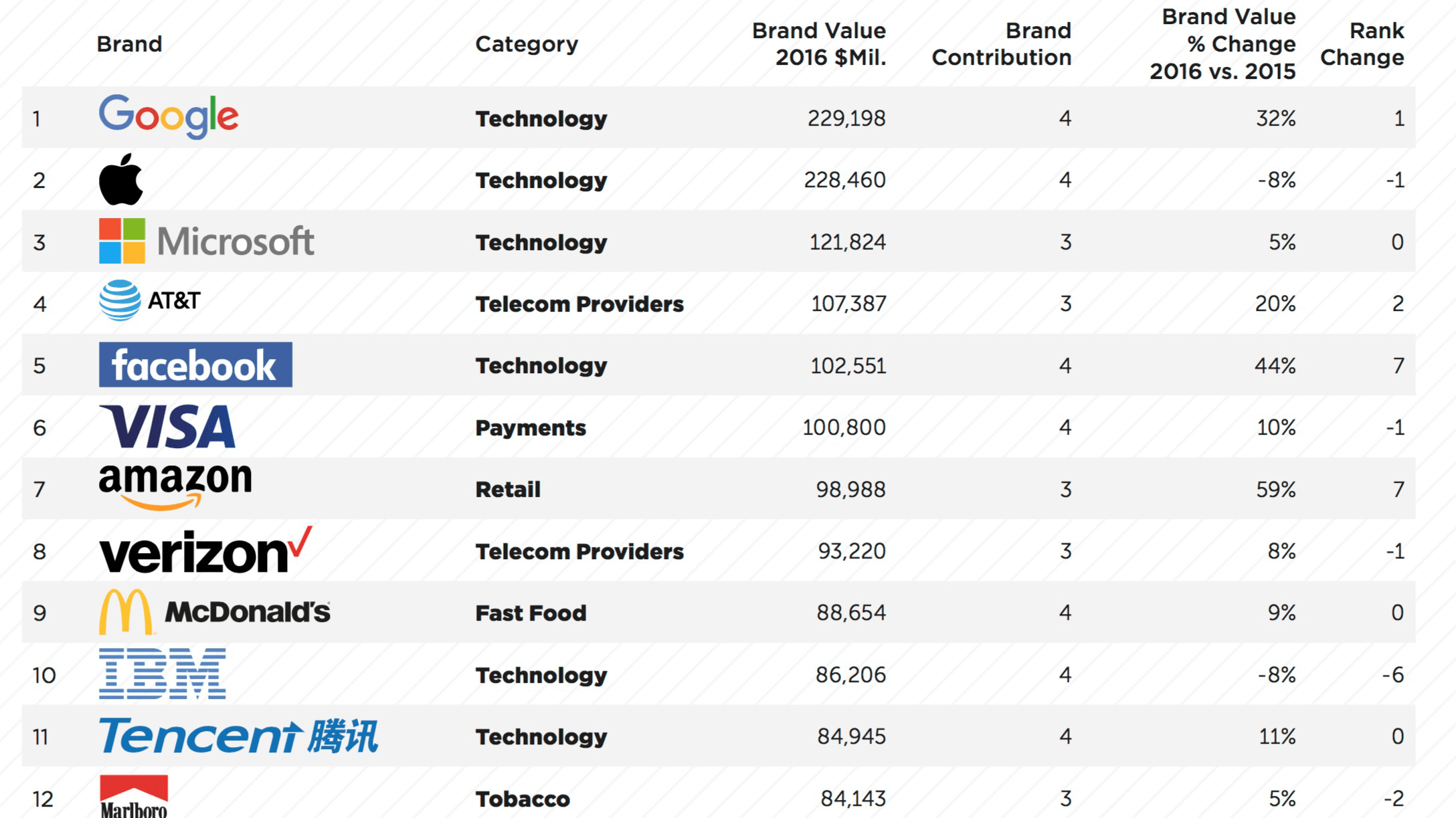 Wenn man sich die Liste über die Jahre einmal ansieht, fällt auf dass immer mehr IT-Unternehmen in der Auflistung erscheinen und alle anderen Unternehmen nach und nach verschwinden. Von Coca-Cola etwa, das lange Jahre die wertvollste Marke der Welt war, ist in der Top 10 nichts mehr zu sehen. Auch Wal-Mart oder diverse Banken sind in der Liste nicht mehr zu finden.