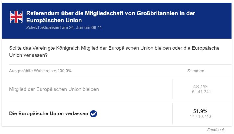 Gestern haben die Briten darüber abgestimmt ob sie in der EU verbleiben oder austreten möchten – und das Ergebnis ist denkbar knapp. Mittlerweile dürften die meisten mitbekommen haben, dass die EU schon bald um ein Land ärmer werden wird. Wer es noch nicht mitbekommen hat, der kann sich nun auch über eine neue temporär eingeführte Onebox in der Google-Websuche informieren lassen.