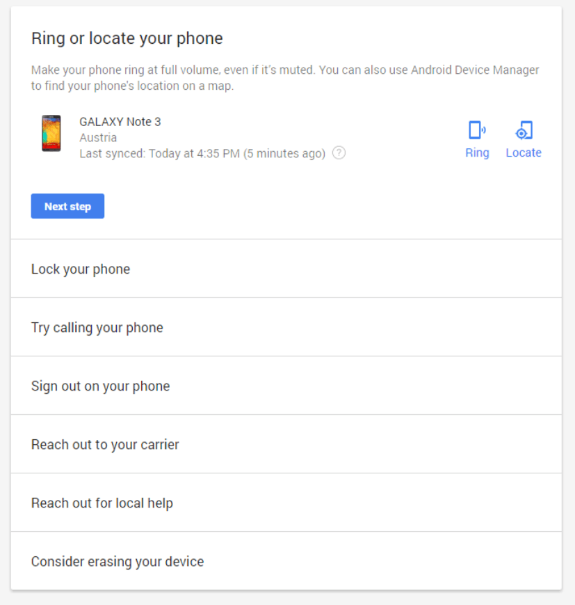 In weiteren Schritten kann man das Smartphone auch läuten lassen, auch wenn es auf Lautlos gestellt ist, falls es sich doch in der näheren Umgebung befinden sollte. Außerdem kann es auch gesperrt oder eine Nachricht bzw. Telefonnummer angezeigt werden. Also genau die gleichen Möglichkeiten die auch der Device Manager seit längerer Zeit bietet. Als letzten Schritt, wenn das Gerät tatsächlich in die falschen Hände geraten ist, kann man auch alle Daten vom Smartphone löschen lassen.
