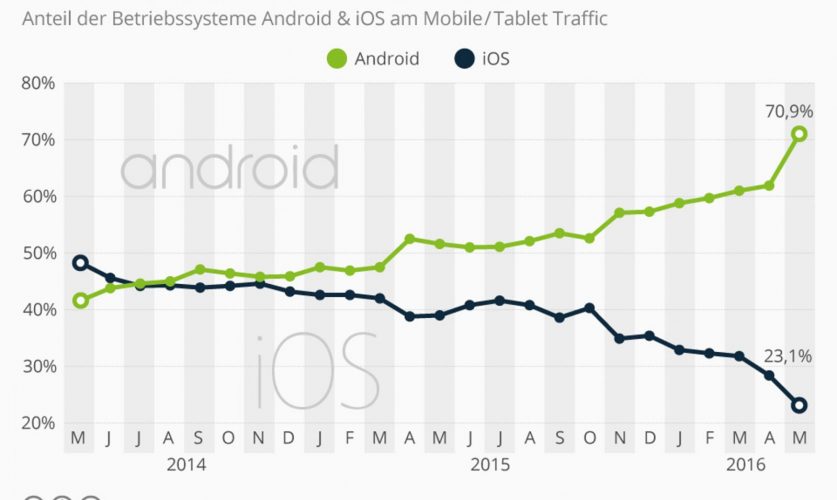 Überraschend ist dieses Statistik nicht, wohl aber das gewaltige Wachstum dass Android in den letzten Monaten hingelegt hat. Noch im Juli 2014 – also vor nicht einmal zwei Jahren – lag iOS noch ganz knapp vor Android. Nach einem Jahr konnte sich Android mit einem Vorsprung von 10 Prozentpunkten schon absetzen, aber erst seit diesem Jahr geht es richtig aufwärts. So steil wie Apples Kurve nach unten zeigt, so steil steigt die Android-Kurve an. Allein in den vergangenen zwei Monaten hat Android fast 10 Prozentpunkte dazu gewinnen können.